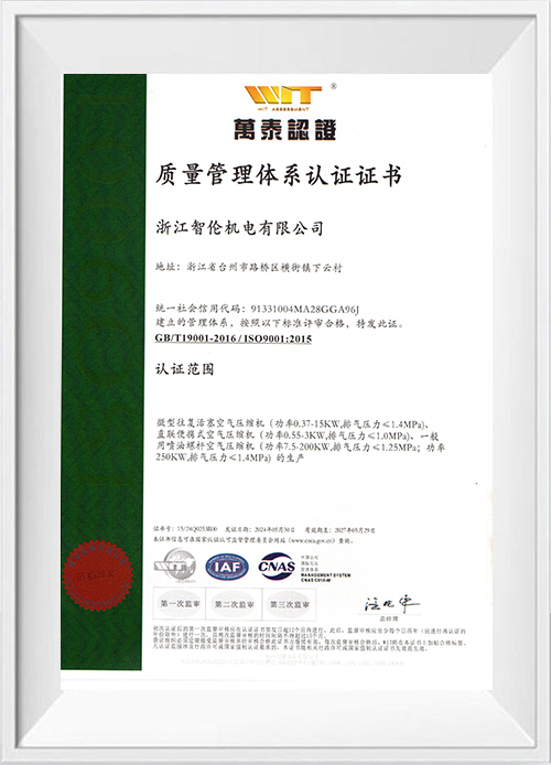 Zhejiang Zhilun Mechanical & Electrical Co., Ltd. es una fábrica que se especializa en investigación y desarrollo, fabricación y venta de compresores de aire de pistón y tornillo. Nuestra empresa está ubicada en la ciudad de Hengjie, distrito de Lugiao, ciudad de Taizhou, a solo 3 km del aeropuerto de Taizhou y a 220 km del puerto de Ningbo. El tráfico es muy conveniente para que nos visites. Nuestra empresa posee una superficie de 50.000 metros cuadrados y cuenta con más de 300 empleados.